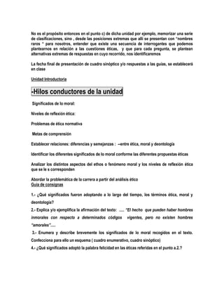 Este documento presenta la asignatura "Ética y deontología profesional" a los estudiantes. Explica que el objetivo es aclarar el significado de estos términos y justificar la necesidad de esta disciplina en la carrera. Resume las diferentes acepciones de términos como "moral", "ética" y "deontología" a lo largo de la historia. También describe brevemente diferentes enfoques de la moral como la búsqueda de la felicidad, el cumplimiento del deber, y la dialógica. El document