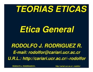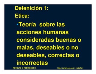 El documento presenta una introducción a las teorías éticas, discutiendo conceptos como moral, valores, responsabilidad moral y libertad. Examina las teorías del determinismo ideológico de Marx y Durkheim, y las posturas sobre la libertad de Sartre. Finalmente, define la ética como el estudio de la moral y los valores asignados a las acciones humanas, y conceptos como axiología y neutralidad axiológica.