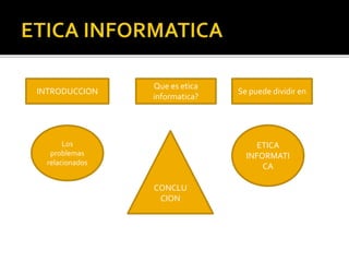 El documento trata sobre la ética informática. Explica que la ética informática surge como una nueva disciplina necesaria para los profesionales de la informática para enfrentar los retos del presente. También describe algunos de los principales problemas éticos relacionados con la informática como los delitos informáticos, la propiedad intelectual, la privacidad de datos y la automatización. Finalmente, argumenta que es importante desarrollar códigos éticos y normas de conducta para los profesionales de la informática y enseñar ética informática.