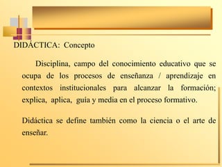 La didáctica pretende fundamentar y regular los procesos de enseñanza-aprendizaje. Los componentes que actúan en el acto didáctico son el docente, los alumnos y los contenidos. El docente juega un papel importante dentro del proceso de interaprendizaje. La didáctica presenta una doble finalidad: regular y dirigir la práctica del proceso de enseñanza-aprendizaje y adquirir y aumentar el conocimiento sobre este proceso.