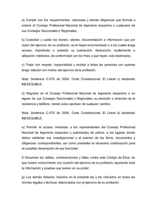 Este documento presenta el marco legal y ético que rige el ejercicio de la ingeniería en Colombia. Describe el Código de Ética Profesional adoptado mediante la Ley 842 de 2003, el cual establece los deberes, obligaciones y prohibiciones generales y específicas para los ingenieros, sus profesiones afines y auxiliares. El código busca guiar el ejercicio profesional con criterios elevados y enaltecer la profesión, protegiendo el interés público, la dignidad de la profesión y las relaciones entre coleg