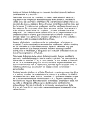 El documento discute varios temas éticos relacionados con las tecnologías de la información y la comunicación (TIC), incluyendo amenazas a la privacidad y seguridad, el cumplimiento de códigos de ética, la propiedad intelectual de software, decisiones tomadas por sistemas expertos, acceso público a la información, y los efectos de la sociedad de la información. También analiza la relación entre la ética y la competitividad en las organizaciones.