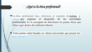 La ética profesional es un conjunto de normas y valores que guían el comportamiento en el ámbito laboral, promoviendo la responsabilidad, honestidad y justicia. Su importancia radica en que establece pautas para la correcta actuación de los profesionales, priorizando el bien común sobre los intereses individuales. Los códigos de ética sirven como guías normativas que rigen el comportamiento de los profesionales y fomentan la confianza en la sociedad.