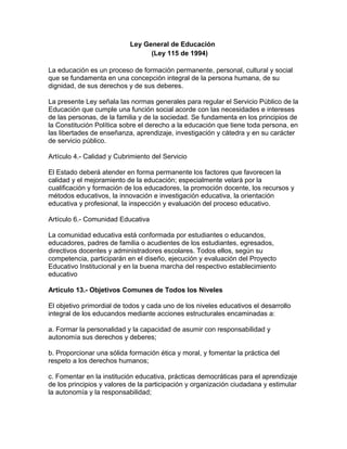 La Ley General de Educación establece los principios y normas que rigen la educación en Colombia. Define la educación como un derecho de toda persona y un servicio público. Establece los objetivos y componentes obligatorios de cada nivel educativo, así como los deberes del Estado y la comunidad educativa para garantizar una educación de calidad.