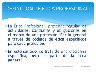 La ética profesional pretende regular las actividades y conductas de las profesiones a través de códigos específicos. Una profesión requiere estudios especializados, formación y habilidades para servir a la comunidad, mientras que un oficio se aprende a través de la experiencia. La diferencia principal es que una profesión necesita titulación académica.
