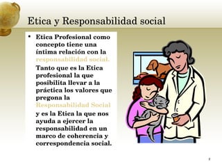 Este documento describe los principios éticos que deben guiar la conducta profesional de acuerdo a la responsabilidad social. Explica que la ética profesional es necesaria para implementar los valores de la responsabilidad social en la práctica. Luego detalla las dimensiones ante las cuales un profesional debe actuar de manera ética: ante la ley, los derechos humanos, el medio ambiente, la comunidad, la organización donde trabaja y su propia profesión. Finalmente, ofrece recomendaciones concretas sobre cómo aplicar principios étic