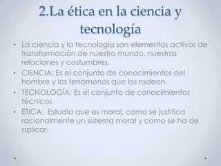 Este documento trata sobre la ética en la ciencia y la tecnología. Explica las implicaciones éticas de la investigación científica y el desarrollo tecnológico, así como el comportamiento ético que deben tener los investigadores y tecnólogos. También brinda una breve historia de la quimioterapia y la radioterapia, así como su aplicación en el tratamiento del cáncer.