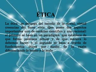 El documento contrasta la ética y la moral. La ética se refiere al estudio reflexivo de los principios que fundamentan la moral, mientras que la moral se compone de las normas y valores que guían la conducta de un grupo. La ética busca el bien individual a través de la razón, mientras la moral salvaguarda el bien del grupo mediante la adhesión a normas compartidas.