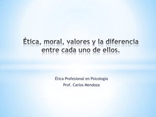 La ética se refiere al estudio de los actos morales correctos e incorrectos y es una rama de la filosofía. La moral se concreta en normas de comportamiento que guían las acciones de las personas. Los valores son creencias fundamentales que determinan la conducta y ayudan a las personas a elegir entre opciones. La ética se basa en la reflexión individual mientras que la moral se impone a través de la sociedad.