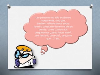 Este documento define la ética y la moral. Explica que la ética es el estudio filosófico de la conducta moral y surgió en la antigua Grecia. Las características de la acción moral incluyen que se basa en códigos morales y valores, y que los individuos son libres y responsables de elegir y responder por sus propias acciones. Los valores morales son cualidades en acciones y personas que los humanos apreciamos por sí mismos y no por beneficio egoísta.