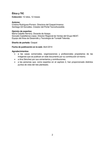 Este documento aborda el tema de la ética en el uso de las tecnologías de la información y la comunicación (TIC). Se define la ética como la rama de la filosofía relacionada con la moral y las normas de conducta humana. Se señala que el uso de las TIC plantea retos éticos y se debaten cuestiones como el respeto a la privacidad y los derechos de las personas. Asimismo, se analizan las oportunidades y amenazas de las TIC, y se proponen metodologías como los códig