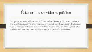 Este documento describe un programa de ética para los servidores públicos de un estado. El programa busca motivar a los empleados públicos, mejorar los resultados y desalentar las prácticas deshonestas para recuperar la confianza de los ciudadanos. También explica los principios éticos como el respeto, la probidad y la eficiencia, y las ventajas que un programa de ética puede traer tanto para los empleados como para las instituciones gubernamentales.