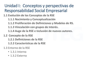 Este documento resume la evolución del concepto de responsabilidad social empresarial desde los años 1950 hasta la actualidad. Se describe cómo el concepto ha ido cambiando de un enfoque en las obligaciones de las empresas hacia los accionistas a uno más amplio que incluye las responsabilidades hacia los grupos de interés internos y externos. También se explica cómo el concepto se ha ido vinculando a ideas como el desarrollo sostenible y el triple resultado bottom line. El documento concluye definiendo la responsabilidad social empresarial como un compromiso continuo de las empresas