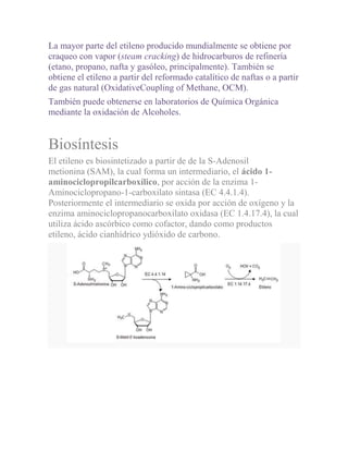 El etileno es un compuesto químico orgánico formado por dos átomos de carbono unidos por un doble enlace. Es uno de los productos químicos más importantes de la industria y se produce naturalmente en las plantas. Se obtiene principalmente mediante el craqueo con vapor de hidrocarburos de refinería y también a partir del reformado catalítico de naftas o gas natural.