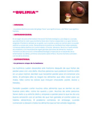Este documento describe la etiología y estructura de la bulimia. Explica que la bulimia comienza a menudo después de dietas estrictas que conducen a atracones de comida seguidos de sentimientos de culpa. Luego, la persona desarrolla métodos de purga como el vómito o uso de laxantes para compensar las calorías ingeridas. El documento concluye instando a prevenir la bulimia mediante la detección temprana y el apoyo a quienes muestran sus síntomas.
