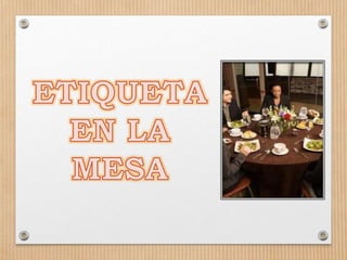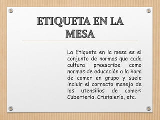 La etiqueta en la mesa incluye normas sobre la ubicación correcta de los cubiertos, como poner los tenedores a la izquierda y los cuchillos y cucharas a la derecha. Existen dos estilos para usar los cubiertos - el estilo americano y el estilo europeo. También se describen las características y usos de diferentes tipos de cubiertos, copas y servilleta.