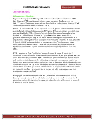 El documento describe la historia y conceptos básicos de HTML. Explica que HTML fue desarrollado originalmente por Tim Berners-Lee en 1991 y se ha convertido en el estándar para publicar documentos en la World Wide Web. Luego resume las etiquetas y atributos básicos de HTML para formato de texto, elementos gráficos, formato y presentación.