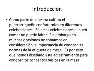 Este documento presenta las normas básicas de etiqueta de mesa para una cena semi-formal. Explica cómo colocar el mantel, servilletas y vajilla correctamente. Luego detalla el orden apropiado para servir los alimentos, incluyendo sopas, pan, verduras, carnes, pescados, mariscos, pastas y postres. Para cada tipo de alimento, indica los utensilios que deben usarse para comerlos de manera apropiada. El objetivo es organizar una mesa y cena semi-formal siguiendo las normas de etiqueta