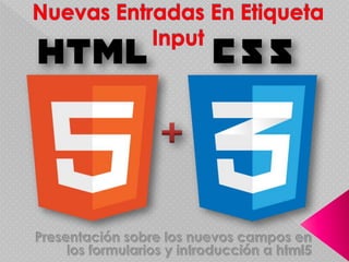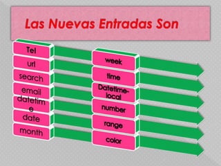 El documento describe diferentes tipos de entrada de datos HTML como tel, url, email, fecha, hora, número, rango y color. Cada tipo tiene propiedades específicas como formato, validación y soporte de navegador. Algunos tipos como tel, fecha y hora no imponen una sintaxis fija debido a variaciones entre países y navegadores.