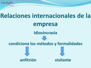 Este documento ofrece información sobre protocolo internacional y las costumbres y formalidades que deben seguirse cuando se visitan diferentes países o se interactúa con personas de otras culturas en el ámbito empresarial. Explica brevemente los protocolos y costumbres sociales más importantes de países como India, Japón y China, incluyendo saludos, presentaciones, regalos, vestimenta e interacciones en reuniones y comidas. El objetivo es crear una buena primera impresión y comunicarse y comportarse de manera respetuosa con las tradiciones del país anfit