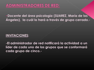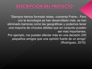 Este documento describe un proyecto educativo que propone utilizar las redes sociales, en particular Facebook, como medio para enseñar la asignatura de Psicología. El proyecto busca motivar a los estudiantes mediante el uso de una herramienta que les resulta atractiva. Se desarrollará en varias etapas en las que los estudiantes investigarán, producirán contenidos y los compartirán a través de la red social. El objetivo es aprovechar las ventajas de las TICs para hacer la enseñanza más dinámica e