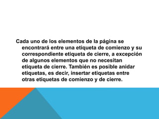 El documento describe los elementos básicos de HTML, incluyendo etiquetas de comienzo y cierre, anidamiento de etiquetas, y comandos específicos como <P> para párrafos, <BR> para saltos de línea, y etiquetas como <HEAD> y <TITLE> para el encabezado y título de una página. Además, explica comandos adicionales como <H1-H6> para encabezados y subtítulos.