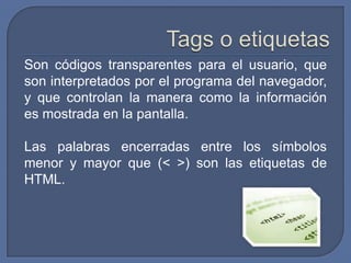 El documento describe las etiquetas HTML básicas para estructurar y dar formato a texto en una página web, incluyendo etiquetas para encabezados, párrafos, enlaces, imágenes y líneas horizontales. Explica cómo usar etiquetas como <body>, <h1-6>, <p>, <br>, <font>, <img>, <a> y <hr> para controlar atributos como color, tamaño y alineación del texto y contenido.
