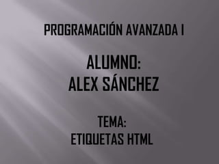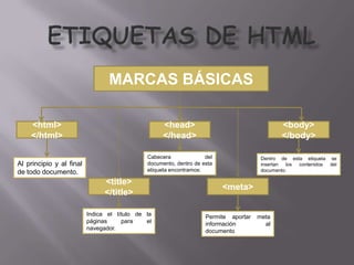 El documento proporciona una guía sobre las principales etiquetas HTML para crear páginas web. Explica las etiquetas básicas como <html>, <head> y <body>, y luego describe cómo formatar texto, crear párrafos, listas, tablas, imágenes, enlaces e insertar marcos. El documento es una referencia útil sobre las herramientas básicas de HTML.