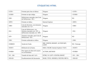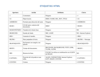 Este documento resume las principales etiquetas HTML y sus atributos más comunes. Explica etiquetas para formato de texto, hipervínculos, imágenes, tablas, formularios y más. Incluye etiquetas para encabezados, párrafos, listas, marquesinas y otros elementos básicos de diseño web. Además, describe los atributos más usados como SRC, HREF, ALIGN, WIDTH y otros para controlar el comportamiento y apariencia de los elementos HTML.