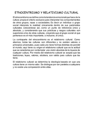 El documento describe el etnocentrismo y el relativismo cultural. El etnocentrismo se define como la tendencia a interpretar otras culturas solo desde la perspectiva de la propia cultura, considerando que los valores y prácticas propias son superiores. El relativismo cultural, por el contrario, reconoce que todas las culturas son diferentes y que no hay valores universales, por lo que las tradiciones de cada cultura solo deben juzgarse desde la propia perspectiva cultural.
