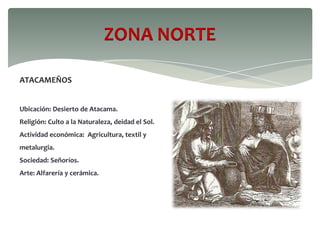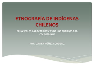 El documento describe las principales características de los pueblos indígenas pre-colombinos de Chile, incluyendo su ubicación geográfica, religión, actividad económica, estructura social y arte. Se dividen en siete grupos de la zona norte, isla de Pascua, zona centro-sur, y zona austral. Cada grupo se caracteriza por su estilo de vida único adaptado a su entorno particular.