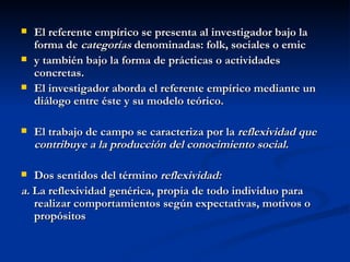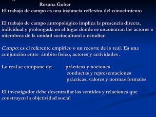 El documento resume los conceptos clave del trabajo de campo etnográfico. Explica que el trabajo de campo implica la presencia del investigador en la cultura estudiada para observar prácticas y significados. El investigador debe usar técnicas como la observación participante y entrevistas para comprender las perspectivas de los informantes, pero también reflexionar críticamente sobre su propio papel y perspectiva.