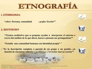 Este documento proporciona una introducción a la socioantropología y la etnografía. Explica la etimología del término, sus definiciones, orígenes e investigadores principales como Malinowski y Boas. Describe los tres elementos esenciales de la investigación etnográfica (etic, emic e in situ) y los pasos del proceso que incluyen la observación participante, descripción y análisis. También cubre temas como los tipos de investigación etnográfica, ventajas y desventajas del método.