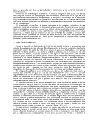 El documento describe el método etnográfico de investigación. Explica que la etnografía se enfoca en describir e interpretar las modalidades de vida de grupos de personas que viven juntas. Señala que los miembros de un grupo comparten una estructura lógica subyacente que se manifiesta en su vida aunque no es explícita. El objetivo es crear una imagen fiel del grupo estudiado para contribuir al entendimiento de grupos más amplios con características similares.