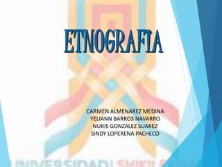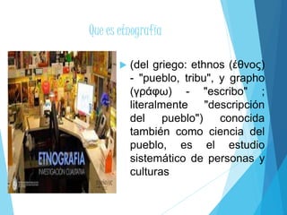 El documento define la etnografía como el estudio sistemático de personas y culturas. Explica que la etnografía implica observar las prácticas culturales de grupos sociales para contrastar lo que dicen con lo que hacen. Detalla las características de la etnografía como método de investigación social inductivo y holístico que requiere permanecer en el grupo estudiado para comprender su cultura desde dentro. Finalmente, resume los pasos del diseño etnográfico como seleccionar el objetivo de estudio, determinar técnicas