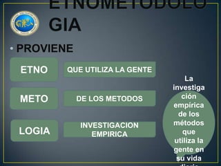 El documento resume los conceptos clave de la etnometodología. En menos de 3 oraciones, describe que la etnometodología estudia los métodos que la gente usa en su vida diaria para dar sentido al mundo social, tomando influencias de teóricos como Talcott Parsons, Alfred Schutz y el interaccionismo simbólico. Se centra en describir cómo la gente construye cooperativamente la realidad a través de la interacción cotidiana.