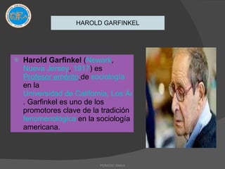 El documento describe los conceptos clave de la etnometodología, una corriente sociológica fundada por Harold Garfinkel que estudia los métodos utilizados por los individuos para organizar su vida cotidiana y producir el orden social. La etnometodología analiza conceptos como la indexicalidad, la reflexividad y la noción de miembro para describir cómo se construye el mundo social a través del lenguaje natural y la interacción diaria. También menciona a precursores como Talcott Parsons y Alfred Schütz que influyeron en el desar