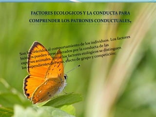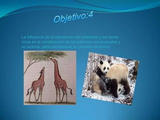 El documento discute la evolución de los patrones de comportamiento en los animales. Explica que las interacciones entre los organismos y su ambiente influyen en la construcción de los patrones conductuales y su desarrollo evolutivo. También describe conceptos clave como el nicho ecológico y cómo la competencia entre especies puede eliminar a una de ellas si compiten por el mismo nicho. Además, explica que los animales más complejos han desarrollado estrategias conductuales más eficientes para responder a estímulos internos y externos