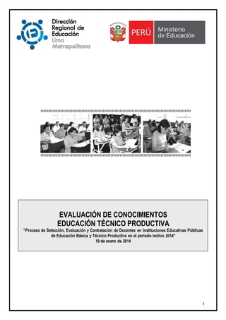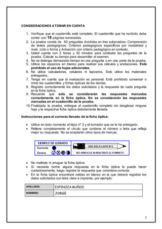 El documento presenta consideraciones sobre una evaluación de conocimientos para docentes. Contiene 3 subpruebas con preguntas sobre comprensión de textos pedagógicos, criterios específicos por nivel educativo y actuación pedagógica. También incluye instrucciones para responder la prueba y llenar correctamente la ficha óptica.