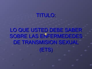 Este documento resume las principales enfermedades de transmisión sexual (ETS), incluyendo sus síntomas y factores de riesgo. El documento describe ETS como gonorrea, herpes genital, clamidia, sífilis, VIH y verrugas genitales. Explica que las ETS se transmiten a través de la actividad sexual y se pueden prevenir mediante el uso de condones, tener una sola pareja sexual no infectada, y postergar el inicio de las relaciones sexuales.
