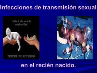 El documento resume las principales enfermedades de transmisión sexual, incluyendo virus (VIH, herpes, VPH), bacterias (gonorrea, clamidiasis, sífilis), hongos (candidiasis), protozoos (tricomoniasis) y parásitos (piojo de pubis). Cada agente infeccioso causa una infección específica con síntomas característicos y posibles consecuencias como esterilidad, daño a órganos o cáncer. La hepatitis B también se transmite sexualmente y puede causar una infección