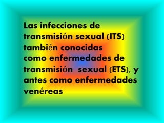 Las infecciones de transmisión sexual (ITS) son enfermedades infecciosas que se transmiten principalmente a través del contacto sexual y pueden causarse por bacterias, virus, hongos o protozoos. Algunas de las ITS más comunes son la gonorrea, la sífilis, el virus del papiloma humano (VPH) y el virus de la inmunodeficiencia humana (VIH).