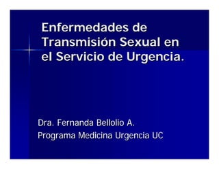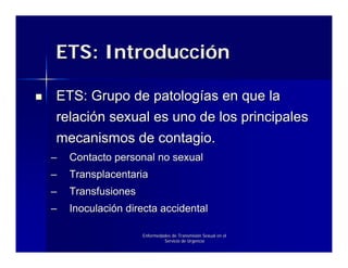 El documento resume las principales enfermedades de transmisión sexual que se presentan en el servicio de urgencia, incluyendo gonorrea, uretritis no gonocócica, clamidias, tricomoniasis y sífilis. Explica los agentes causales, síntomas, diagnóstico y tratamiento de cada una. También describe la epidemiología e importancia de las ETS y sus posibles complicaciones si no son tratadas adecuadamente.