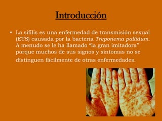 La sífilis es una enfermedad de transmisión sexual causada por la bacteria Treponema pallidum que se transmite a través del contacto directo con úlceras sifilíticas, principalmente durante relaciones sexuales. Los síntomas incluyen úlceras, erupciones cutáneas y lesiones mucosas. Si no se trata, la sífilis puede avanzar a fases más graves que afectan órganos internos. Se diagnostica mediante análisis microscópico y se trata fácilmente con antibióticos en sus primer