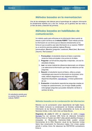 El documento describe varias técnicas y métodos de estudio que los estudiantes pueden usar para mejorar su aprendizaje, incluyendo tomar notas efectivas, usar mnemotecnias, el método PQRST y diagramas de araña. Explica que las técnicas de estudio son estrategias discretas que se pueden aplicar a diferentes campos de estudio y que conocer su propio proceso de aprendizaje es clave. Los objetivos específicos mencionados son identificar factores que impiden el rendimiento óptimo, desarrollar principios te