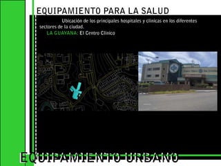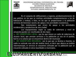 El documento describe diferentes tipos de equipamiento urbano en la ciudad de San Cristóbal, incluyendo equipamiento para la salud, educación, comercialización, cultural, administrativo, seguridad y servicios. Explica la ubicación de varias instalaciones de cada categoría en sectores de la ciudad y analiza aspectos positivos y negativos de cada tipo de equipamiento.