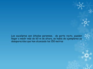 El eucalipto es un árbol perenne originario de Australia que puede alcanzar más de 60 metros de altura. Sus hojas contienen aceites esenciales con propiedades antimicrobianas, expectorantes y antiinflamatorias que lo convierten en un remedio efectivo para el tratamiento de enfermedades respiratorias como la bronquitis, la tos, el catarro y el asma. El eucalipto también se usa para desinfectar heridas y tiene propiedades hipoglucemiantes.