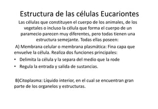 Todas las células eucariotas comparten una estructura básica que incluye una membrana celular, citoplasma, organelos como el retículo endoplasmático, aparato de Golgi, mitocondrias y lisosomas, y estructuras como el citoesqueleto y centriolos, que cumplen funciones vitales como la regulación de sustancias, producción de proteínas y energía, y división celular.