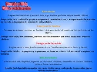 La misa se compone de cuatro partes principales: los ritos iniciales, la liturgia de la palabra, la liturgia de la eucaristía y el rito de despedida. La preparación anticipa la celebración y ayuda a los participantes a pasar de lo individual a lo comunitario. La liturgia de la palabra es un diálogo entre Dios y la comunidad a través de las lecturas y oraciones. La liturgia de la eucaristía transforma los dones en el cuerpo y la sangre de Cristo. El rito final envía a los