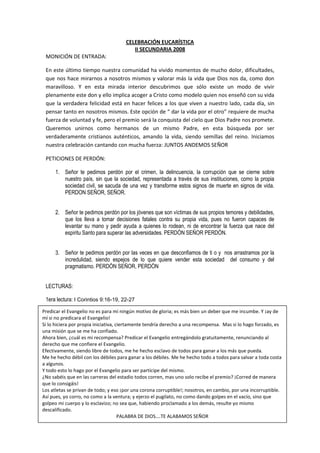 Este documento contiene la transcripción de una celebración eucarística con una comunidad escolar. Incluye la monición de entrada, peticiones de perdón, lecturas bíblicas, peticiones de los fieles, ofertorio y acción de gracias. Los temas centrales son pedir perdón por los problemas sociales, fortalecer la fe de los jóvenes y dar gracias por las bendiciones de la familia, la educación y el amor de Dios.